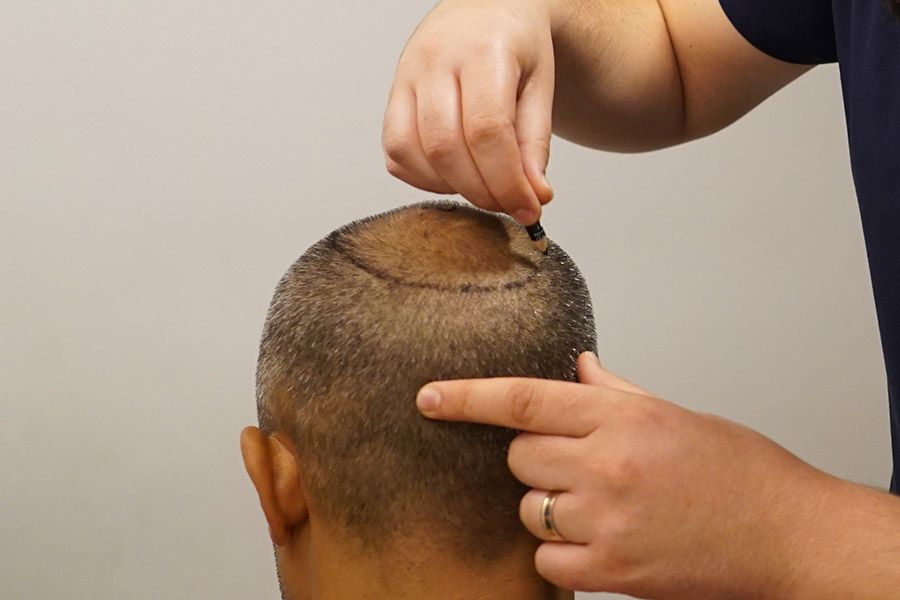 The next stage of a hair transplant is graft extraction. In order to extract donor grafts from the back of a patient's head, the area is shaved. Grafts are extracted one by one - this extraction technique does not leave permanent scars.